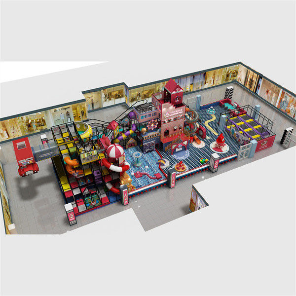 An indoor children's playground themed around a pirate ship, featuring a play structure in the style of a naughty castle, with a wooden texture design and color schemes inspired by the beach and the sea. At the heart of the venue stands a massive soft-padded pirate ship centerpiece, complemented by ninja challenge areas and spiral slides, all working together to recreate the ambiance of a pirate's paradise by the beach.